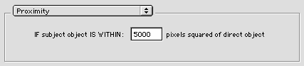 In pixels, the desired range, squared. For example, if you want the condition to be true if the direct object is within 100 pixels of the subject object, this value should be 100 * 100 = 10000.